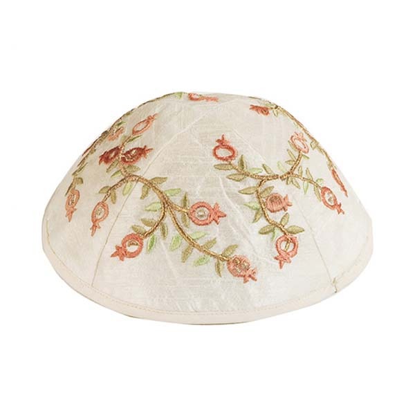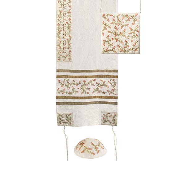 Ce talith est conçu par l’artiste Judaica Yair Emanuel. Il est brodé de grenades de différentes formes et tailles. Les grenades dans les sources juives, expriment un symbole de bénédiction et d’abondance. Brodée sur l’Atarah est la bénédiction que nous récitons lorsque nous nous enveloppons dans le talit. Le talith est fabriqué à partir de coton mélangé avec du polyester avec des broderies de fils de soie. L’ensemble de talith comprend : un talith, un sac de talith et une kippa assortie.